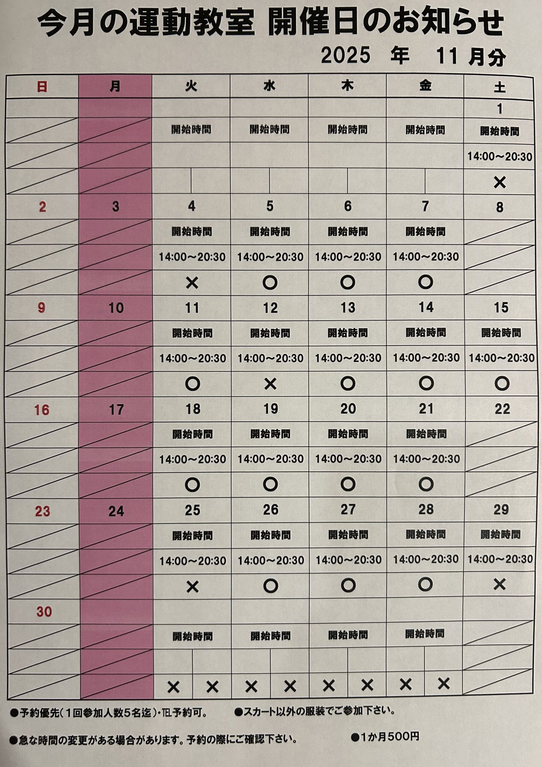 今月の運動教室と悩み相談の予定です