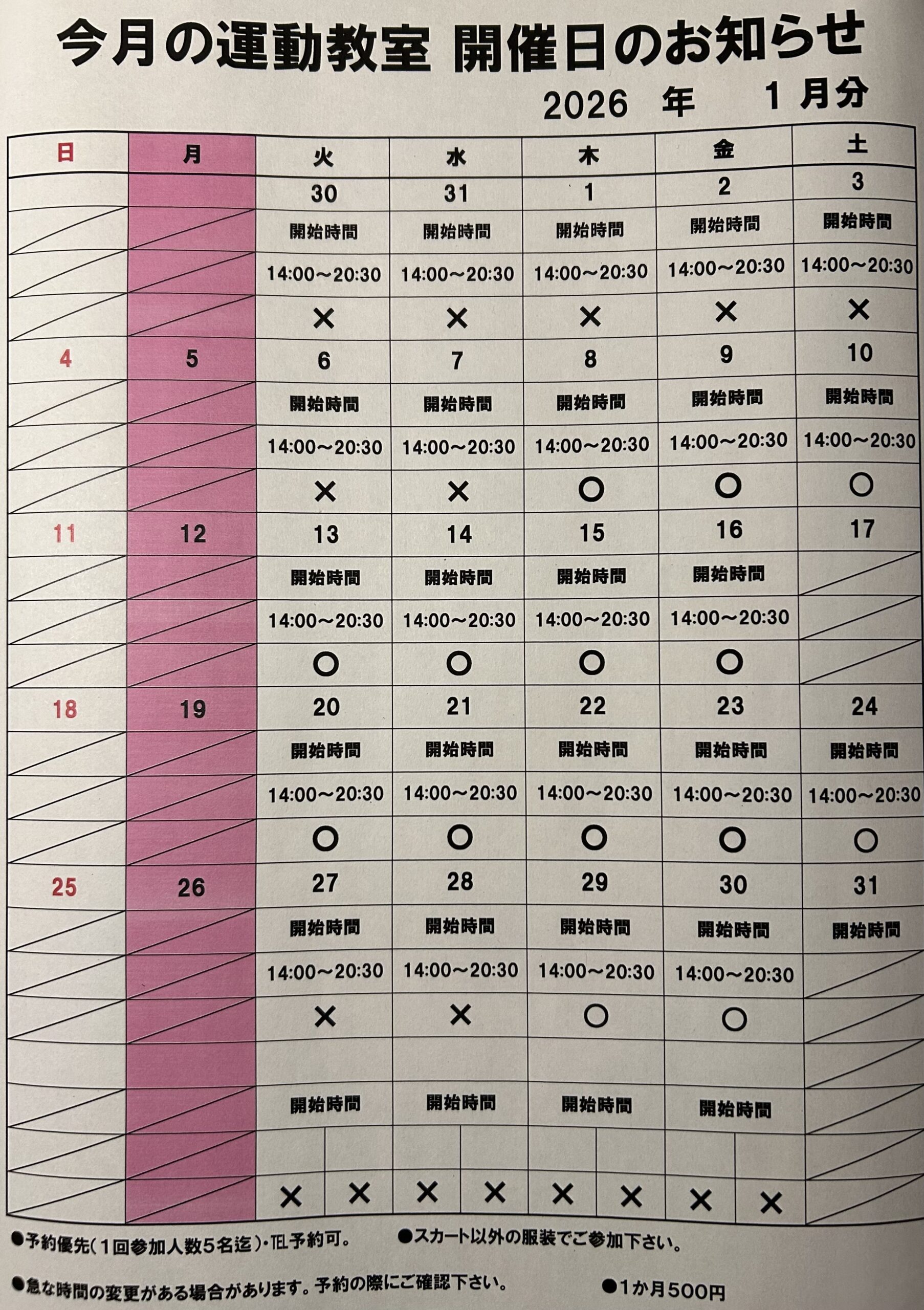 今月の運動教室と相談の日程です