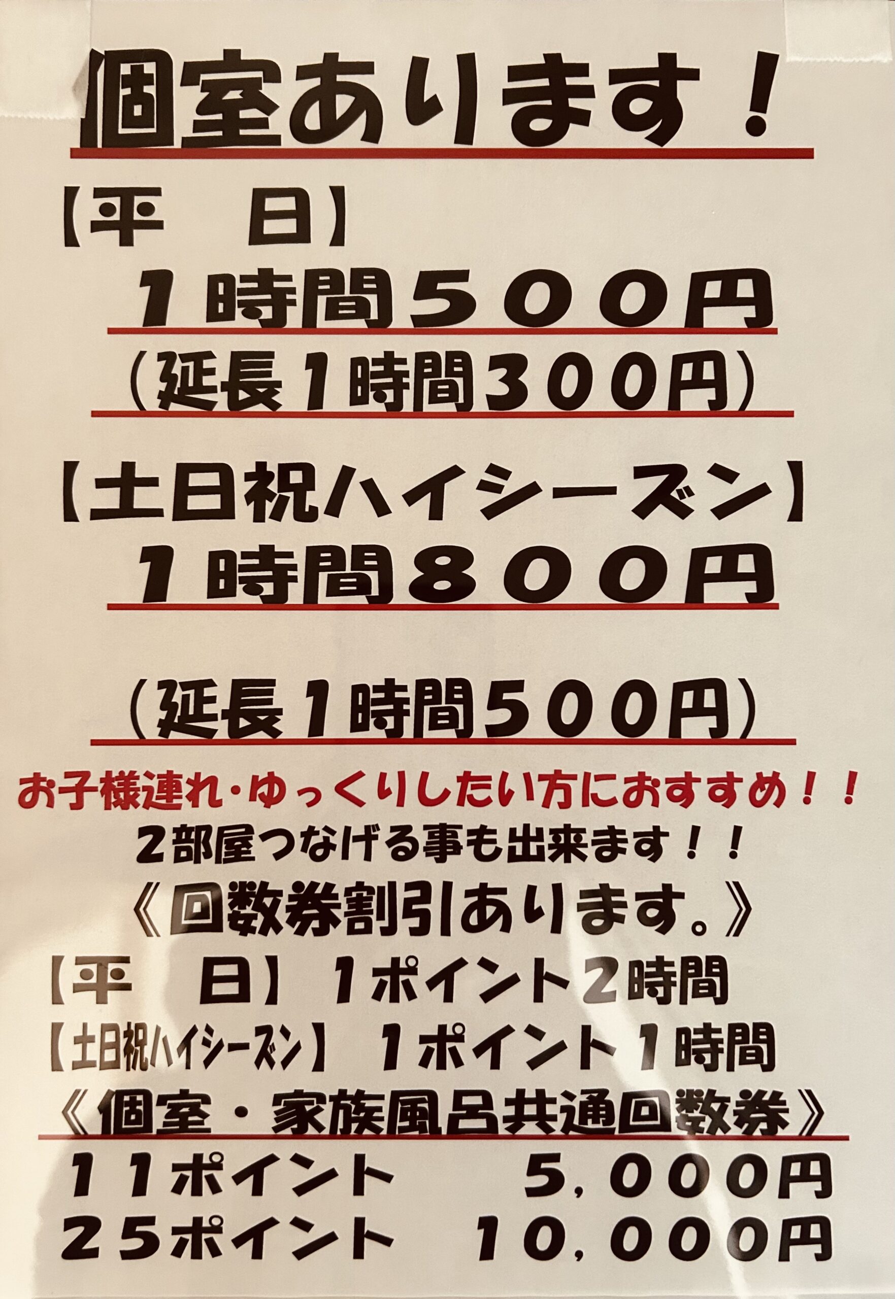 個室利用料を値上げ致します 2025年10月18日 最終更新日時 : 2025年10月18日 管理者 11月より個室利用料金が値上げとなります。家族風呂と個室で使用できる回数券を購入して頂けると大変お得にご利用頂けます!!これを機に是非ご検討ください!!