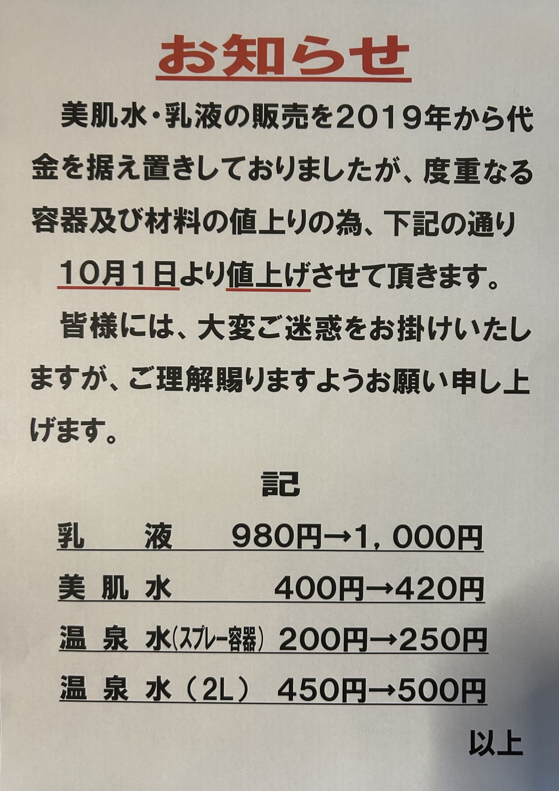 値上げのお知らせ